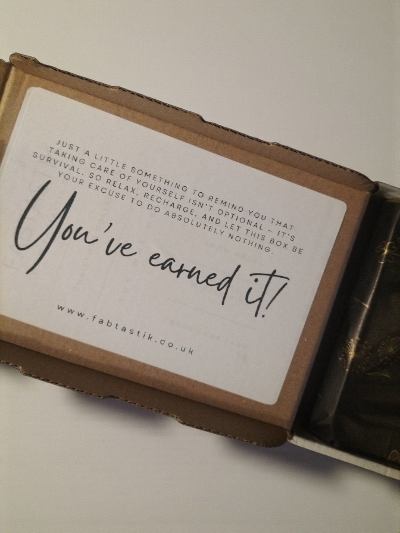 our signature personalised message inside 'Just a little something to remind you that taking care of yourself isn’t optional — it’s survival. So relax, recharge, and let this box be your excuse to do absolutely nothing. You've earned it!'