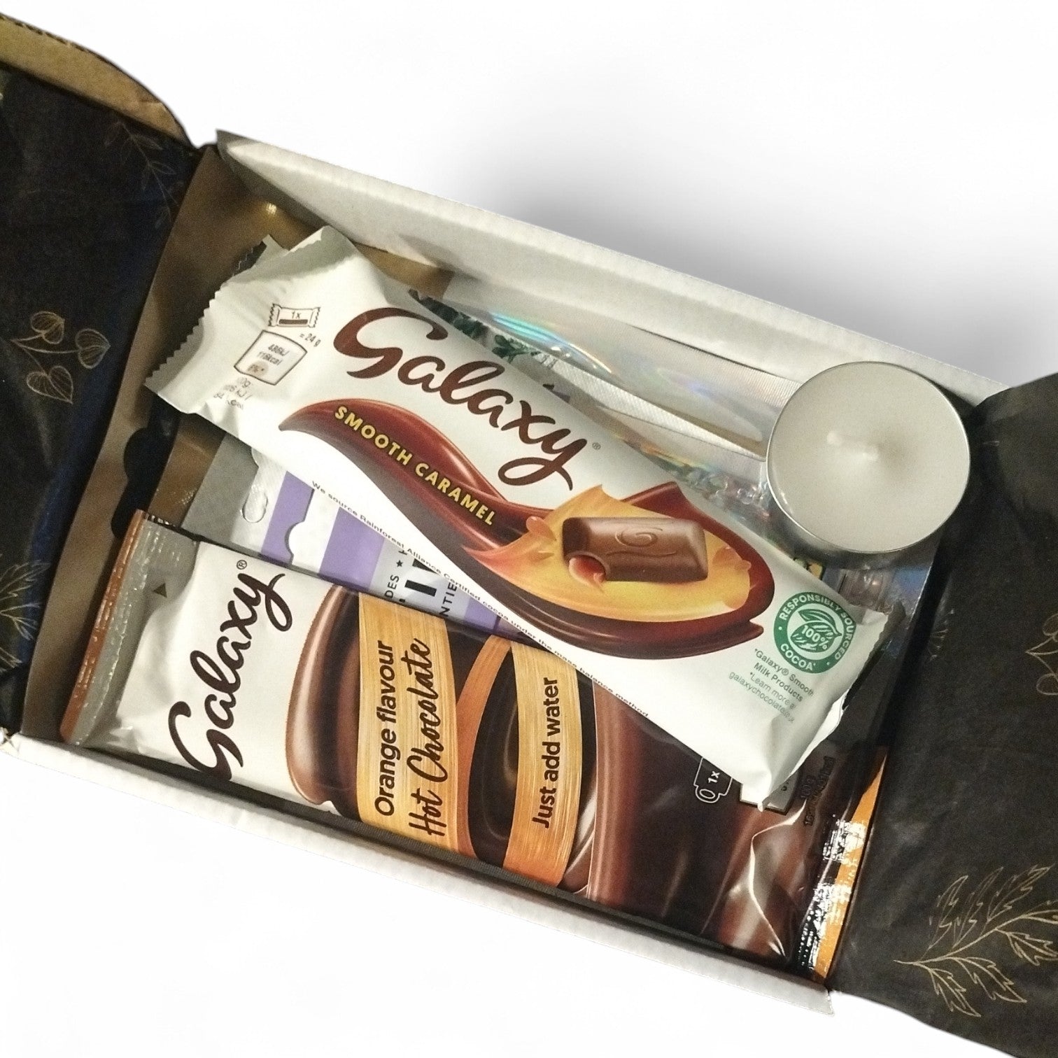 Sweet indulgent treats (galaxy chocolate bar and galaxy hot chocolate sachet (flavour may vary)